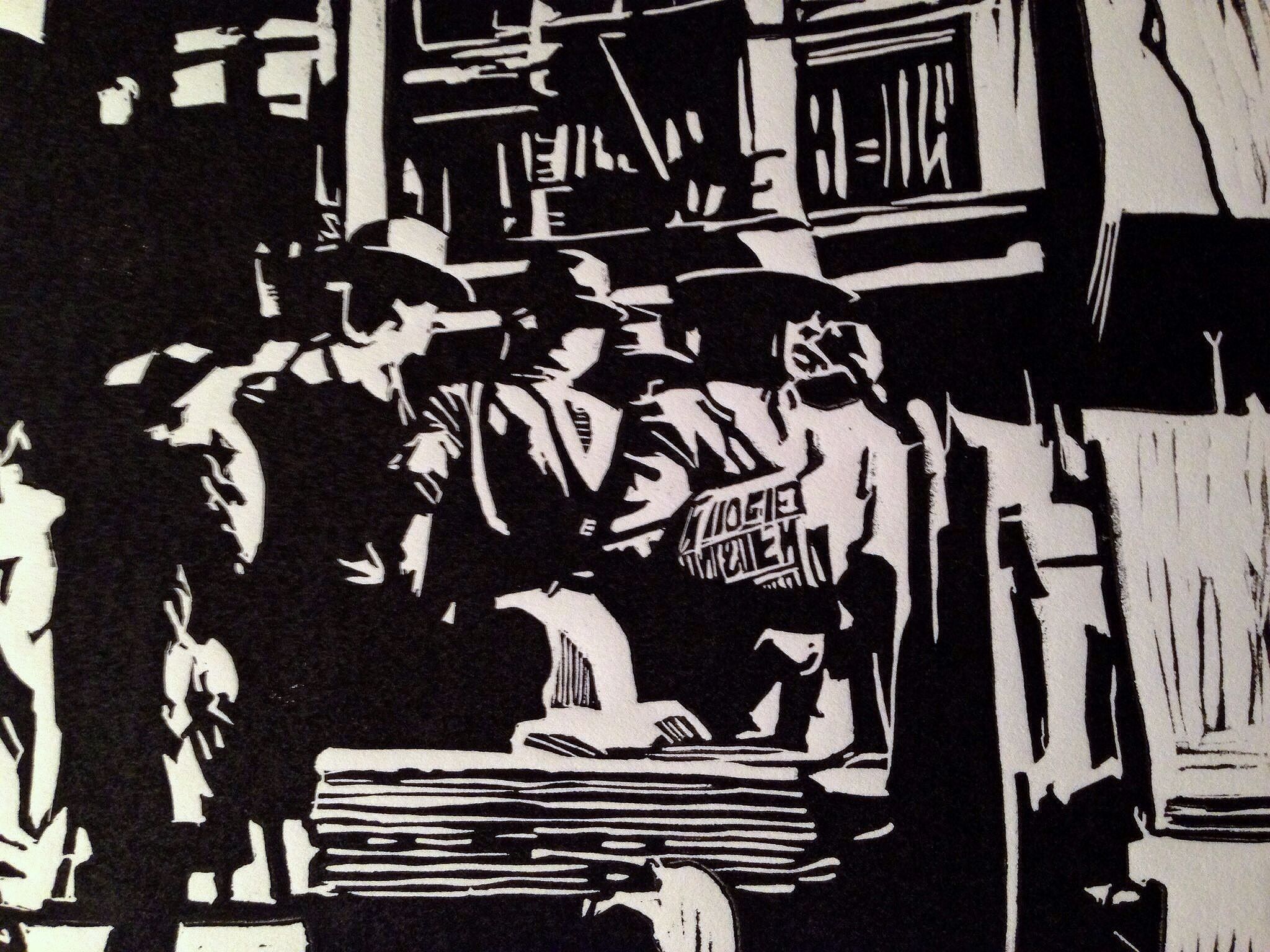 Journal on Wallstreet Date: December 27, 2013Author: artbytjaard Category: Prints Tags: 1940's, journal, linoleum cut print, newspapers, oil paint, wallstreet Post navigation ← Dia de los Muertos Station of my Hart → Linoleum Cut – Oil Paint Print Spread the love: Click to share on X (Opens in new window) X Click to share on Facebook (Opens in new window) Facebook Click to share on LinkedIn (Opens in new window) LinkedIn Click to share on Pinterest (Opens in new window) Pinterest Like Loading... Related
