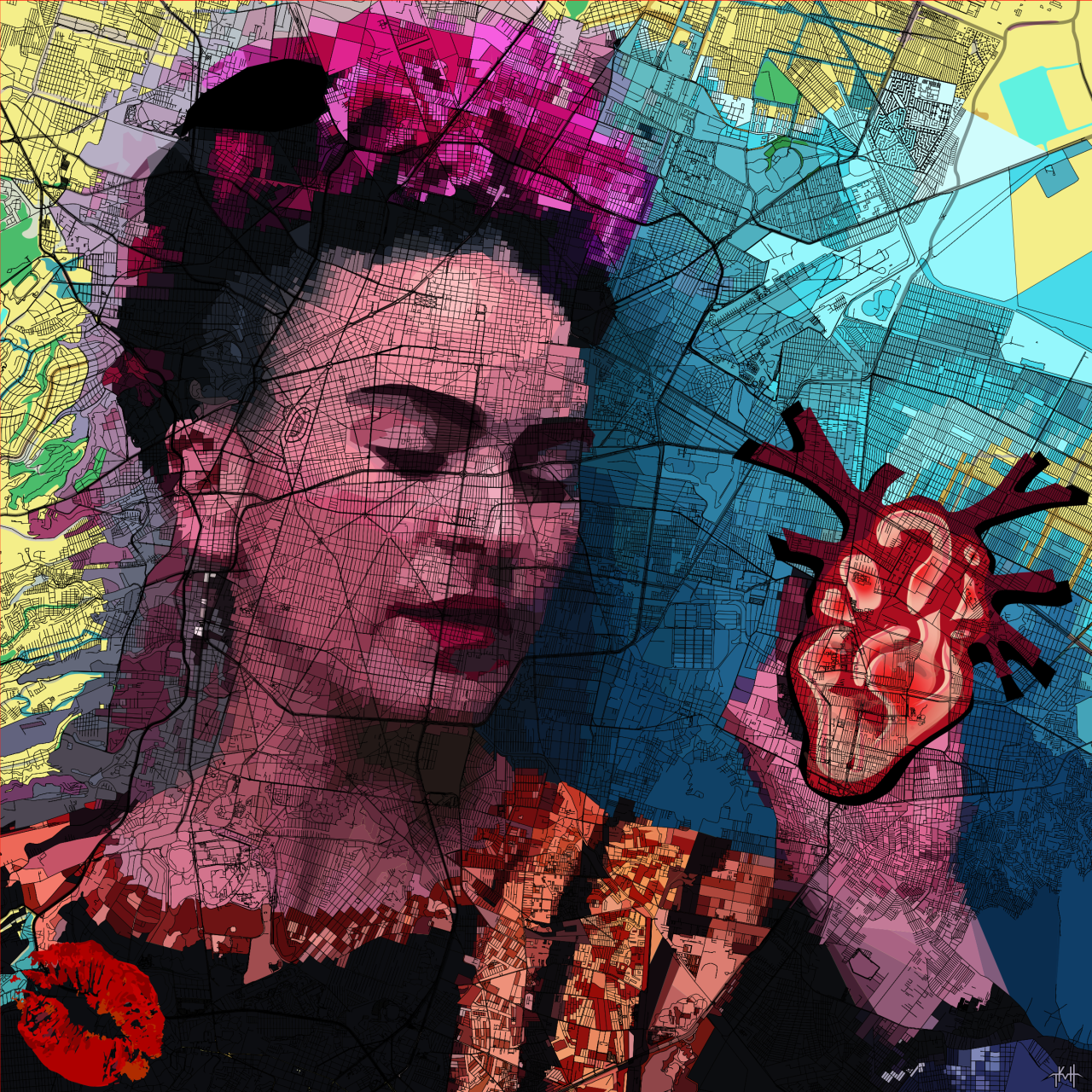 Formed by street patterns of her Mexico City, this work portrays one of Mexico’s most famous painters, Frida Kahlo (1907-1954). Just below her chin, is the location of La Casa Azul (The Blue House), where she lived most of her life. Unlike many of my works that combine the maps of multiple cities, this features the topography of one of the world’s largest metropolitan areas. Frida traveled the world, yet Mexico City was central to her story. The heart in her hand refers to the many she painted, expressing challenges to her health, and her tumultuous relationship with Diego Rivera. The red lipstick in the lower left corner is Frida’s own kiss. She often left her mark on pictures and letters with bright red lipstick as a symbol of her affection. Here she kisses the map, an expression of her love for her city and country.